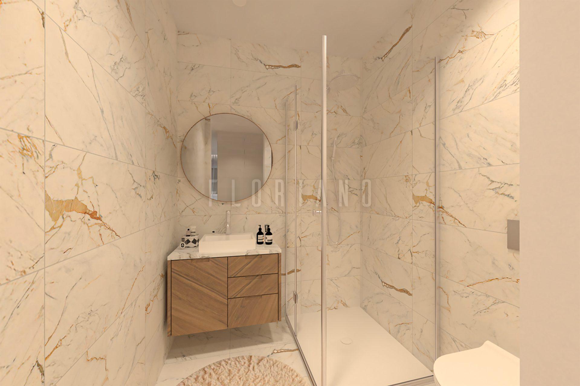• Loiças suspensas Sanitana (série GLAM) e torneiras Aida PLAN;