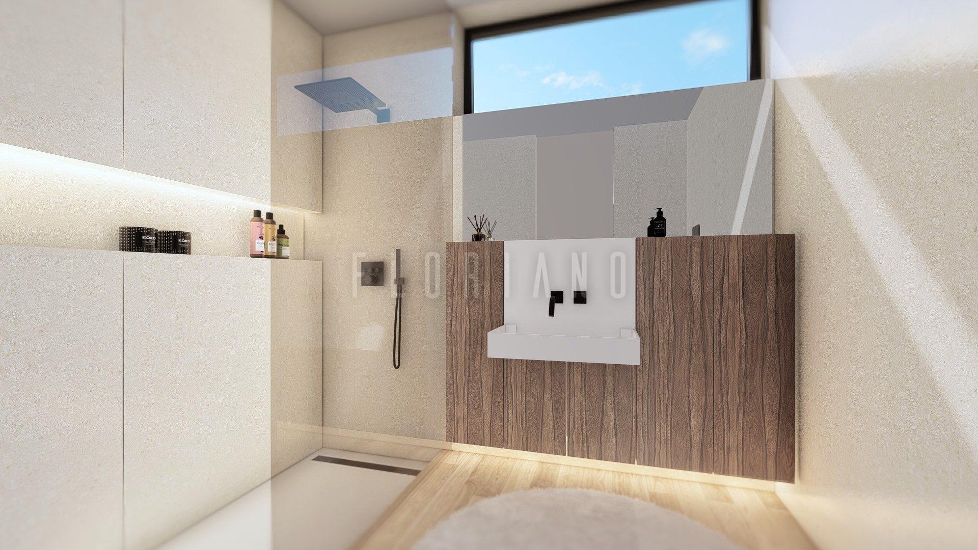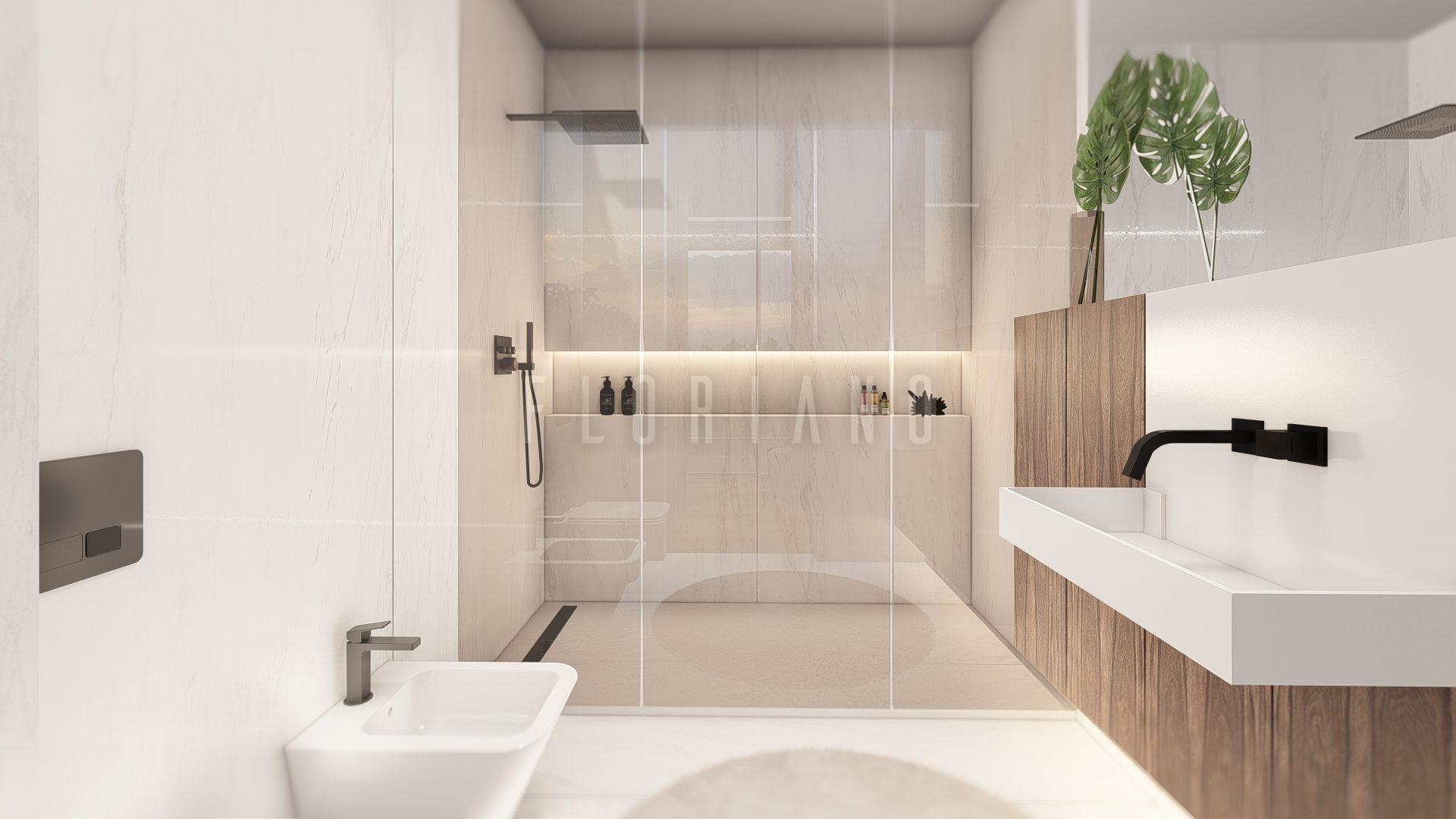 • Casas de banho com louças suspensas e base de duche